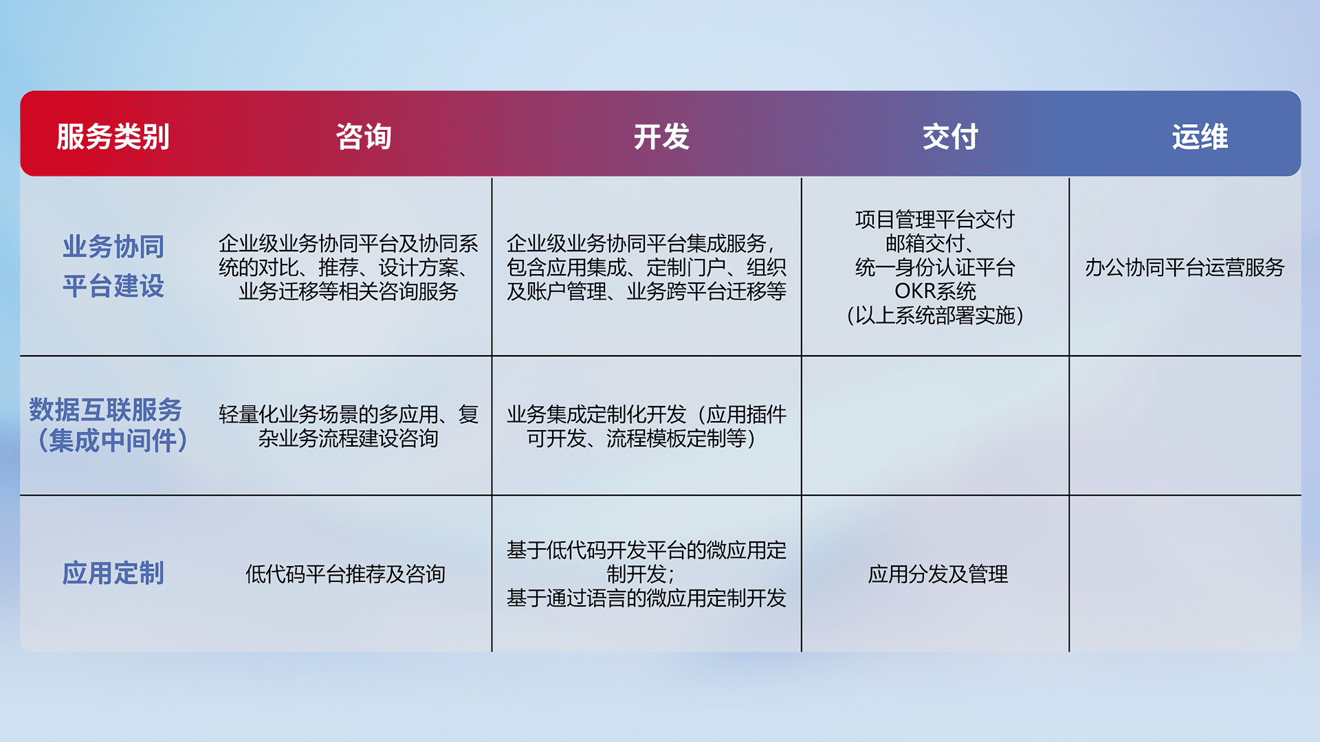 针对钉钉、、、、企微、、IDaas等平台级产品提供产品的规划、、、、方案、、交付、、定制化开发等服务,,实现如统一协同办公、、、、智能客户服务、、、、混合会议管理、、智能数据查询、、等业务场景,,,,实现数字化转型。。