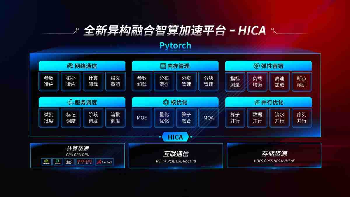 通过自研的服务层、、、、中间适配层、、、、以及调度编排算法,,,,采用数据并行、、、、模型并行等多种并行方式,,把并行计算任务进行有效的分解,,,,使其分别由相应的软件栈和算力资源来承接。。。当GPU资源变化,,HICA可以实时动态调度计算子任务并调整模型拓扑和架构,,,,以充分聚合各种算力资源。。。