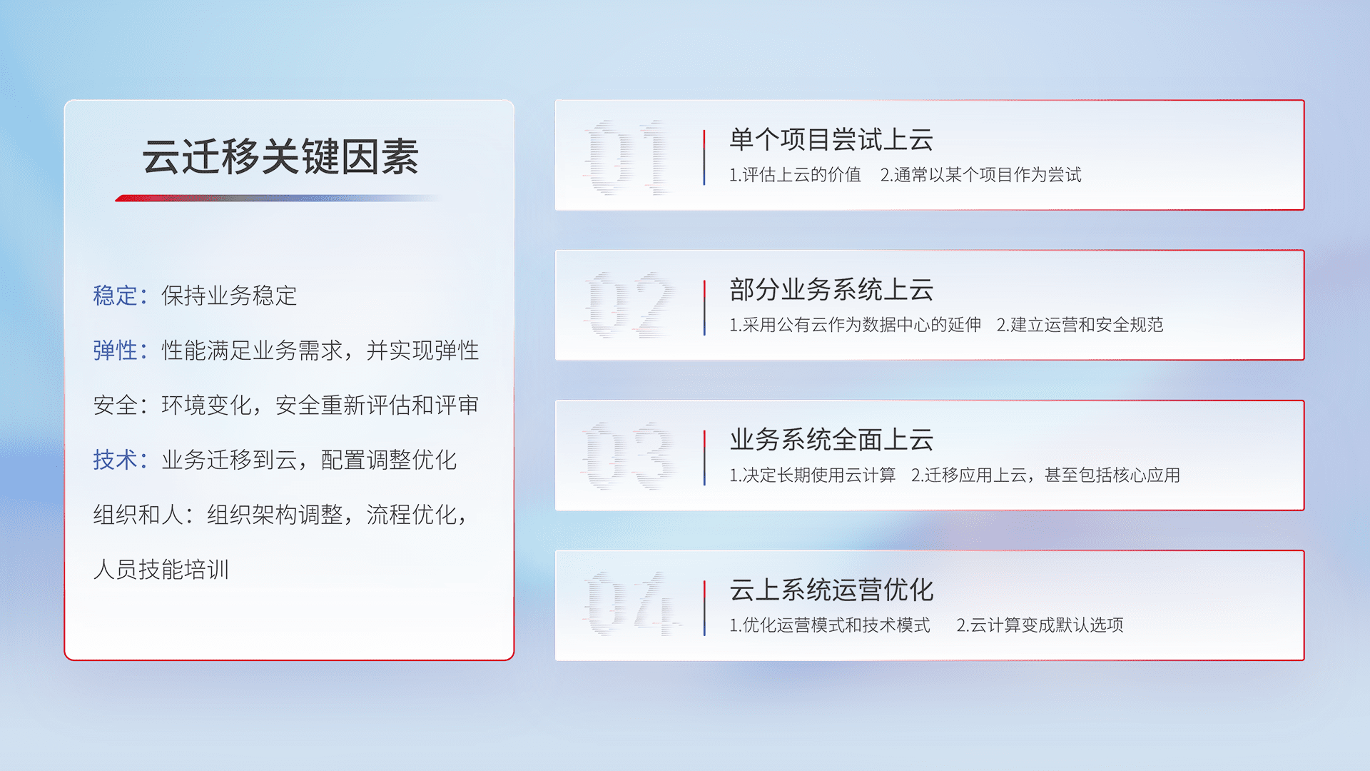 结合实际业务,,从规划设计、、云平台选型、、、、云原生改造、、、、数据迁移、、、、集成交付,,迁移全过程为客户识别最佳上云路径,,,,做好风险识别管理,,,设计网络架构、、身份权限、、、安全审计合规、、、、操作审计、、日志审计、、、、监控告警策略、、、多站点容灾设计等,,,对云上基础设施进行整体规划,,,提升IT治理水平,,以满足弹性、、、高可用、、高性能的需求。。。