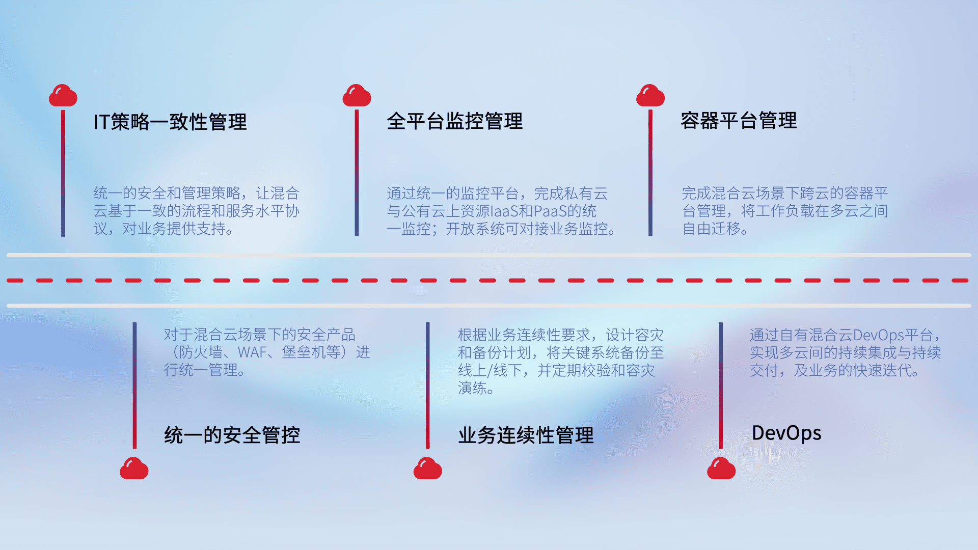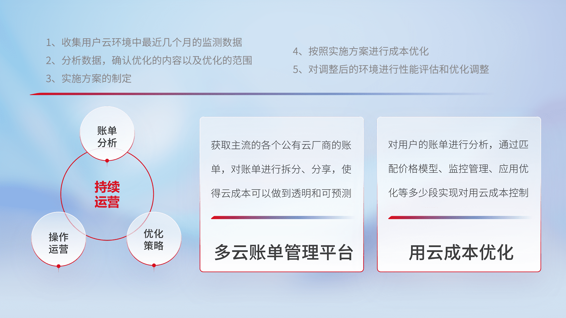 通过多云纳管,,,,以统一的资源数据模型把客户的云资源进行抽象和封装,,进而实现对多云资源的统一操作,,,保障云资源管理的可靠性、、、稳定性与可用性。。。。量身定制化运维内容,,,,配置、、、、开发运维、、、、补丁管理、、备份、、监控、、认证和访问管理、、、、审计和日常巡检等,,,保障在用云过程中的可靠度,,,,稳定度以及高可用率。。。