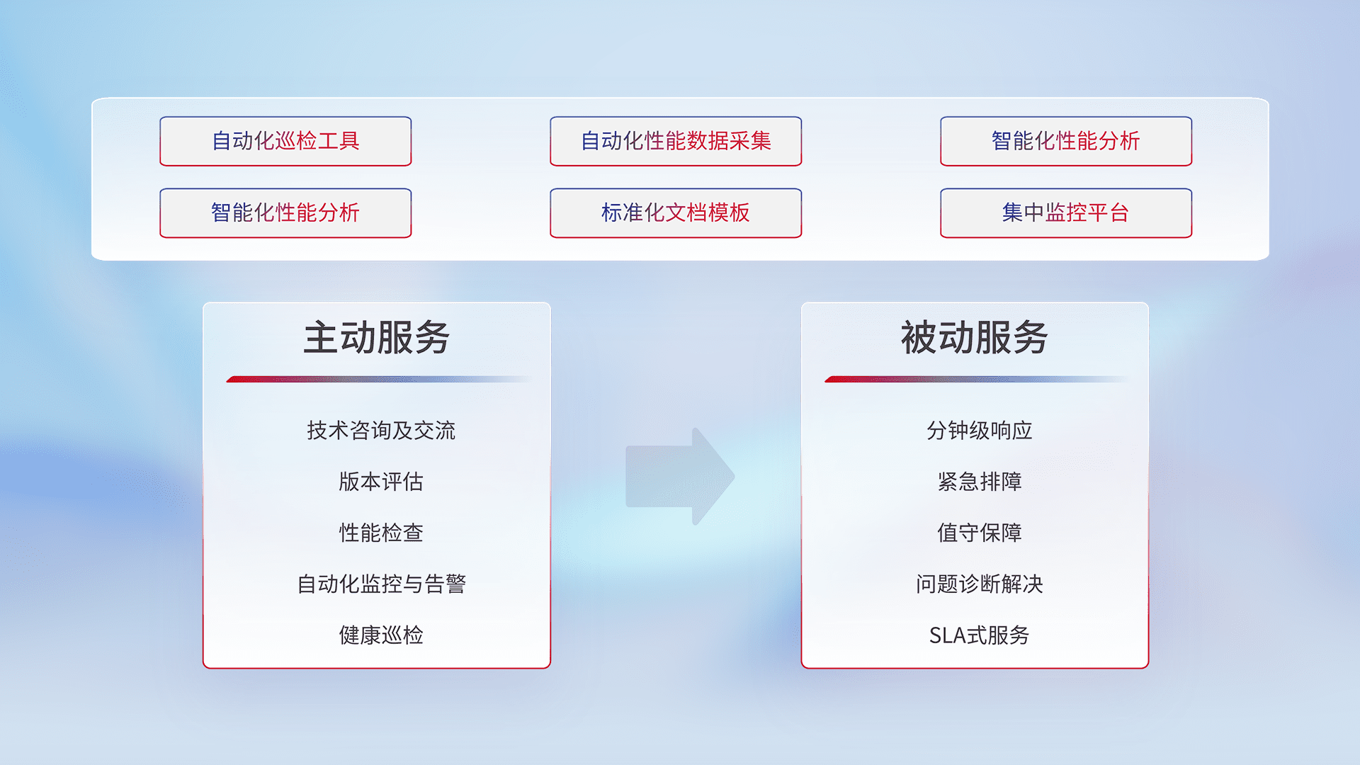 智能化工具和标准化文档,,,,保障服务质量,,,,提供主动服务(包含技术咨询、、、版本评估、、、性能检查、、自动化监控与告警、、、、健康巡检)和被动服务包含(分钟级响应、、、、紧急排障、、、值守保障、、问题诊断解决、、、SLA服务)。。